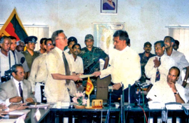 Ranil Wickremesinghe handing over the ceasefire agreement to Jon Westborg, the then Norwegian Ambassador to Sri Lanka