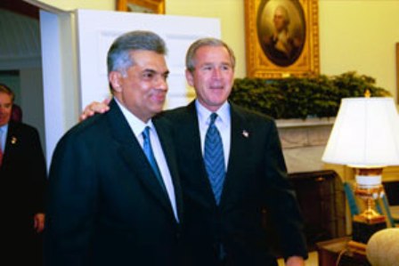 When the President says he is behind you, that means a lot. We came here to discuss mainly about the peace process in Sri Lanka — and I got all the support I want for that. President Bush and the US government have encouraged us to go ahead with the political process to bring peace to Sri Lanka, a peace based on equality, human rights, rule of law, in other words democracy. The backing he has given me has been a tremendous help.”