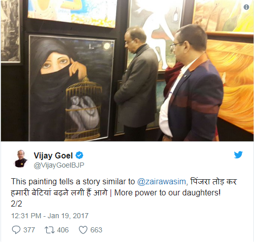 - On January 2017, the former Minister of Youth Affairs and Sports Vijay Goel tweeted that ”This painting tells a story similar to @zairawasim. Pinjra torh kar hamari betiyan barhne lagi hai aage (Our daughters are breaking out of their cages and moving forward) More power to our daughters!” In reply, Zaira tweeted “I feel I must disagree. I request you not to connect me to such a discourteous depiction. Women in hijab are beautiful and free. Moreover, the story depicted through this painting is not even remotely relevant to mine.” After that, Goel responded that Zaira had misunderstood his tweet and he appreciated her work and meant to discourage evil and patriarchal notions.